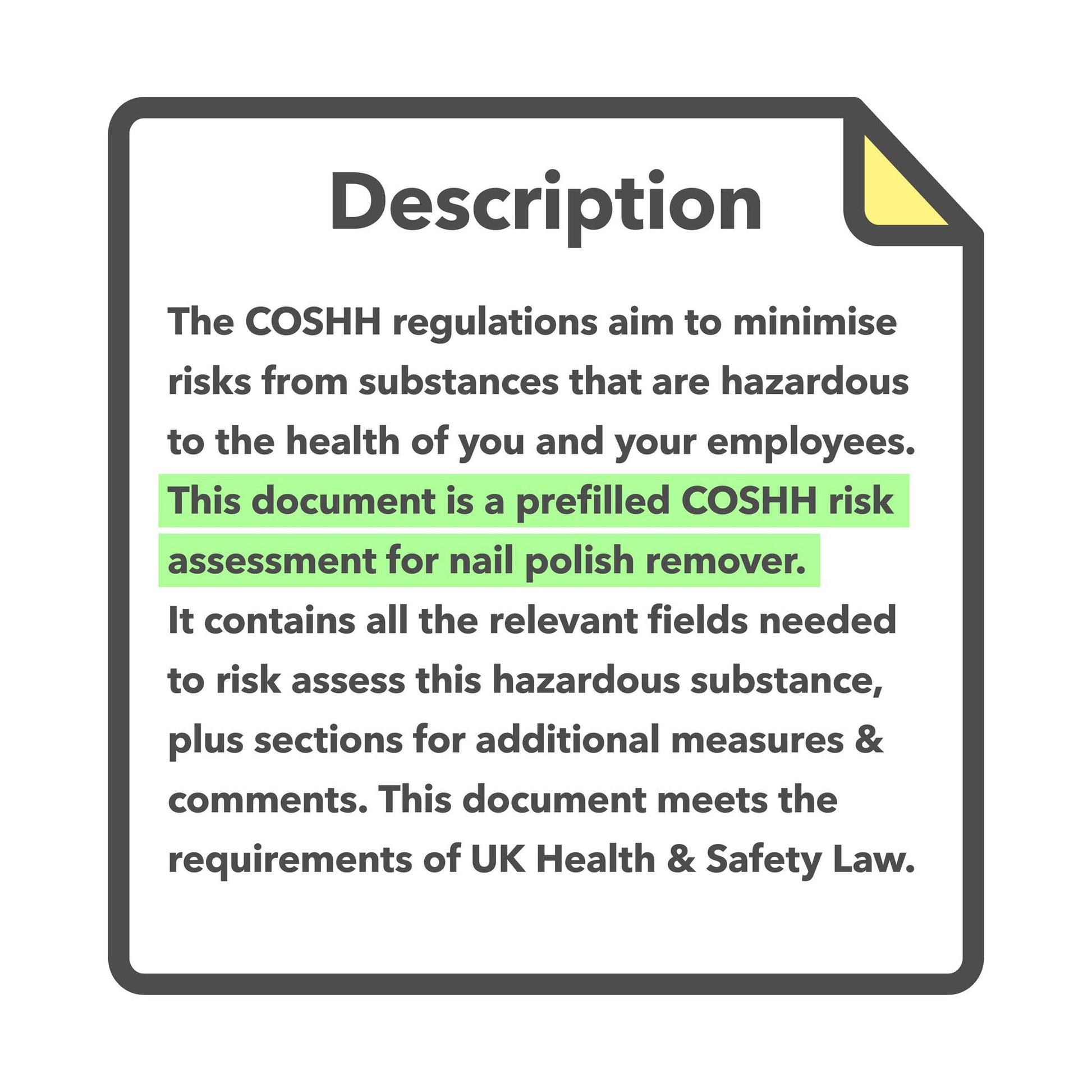 This nail polish remover COSHH risk assessment has been filled in for you, saving you time and helping you to be legally compliant with health and safety law.